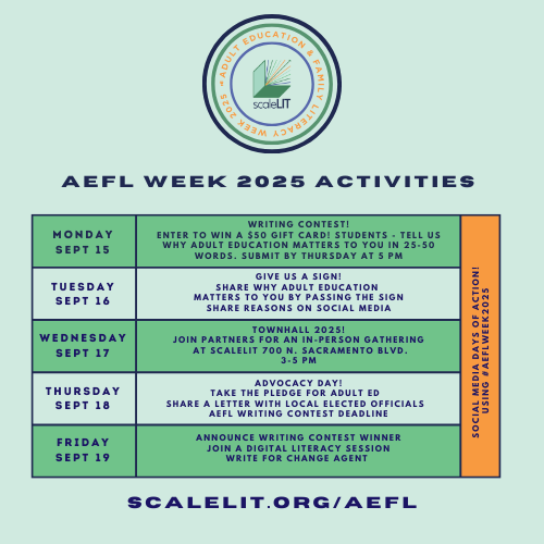 National Adult Education and Family Literacy Week raises public awareness about the need for and value of adult education and family literacy. Its goal is to increase financial and societal support for access to basic education programs for U.S. adults with low literacy, numeracy, and digital skills. Advocates across the country use this opportunity to elevate adult education and family literacy nationwide with policymakers, the media, and the community. Since 2009, National Coalition for Literacy has sponsored National AEFL Week on behalf of its members and the field as a whole, and has worked with Members of Congress to have the week recognized through resolutions in the Senate and the House.