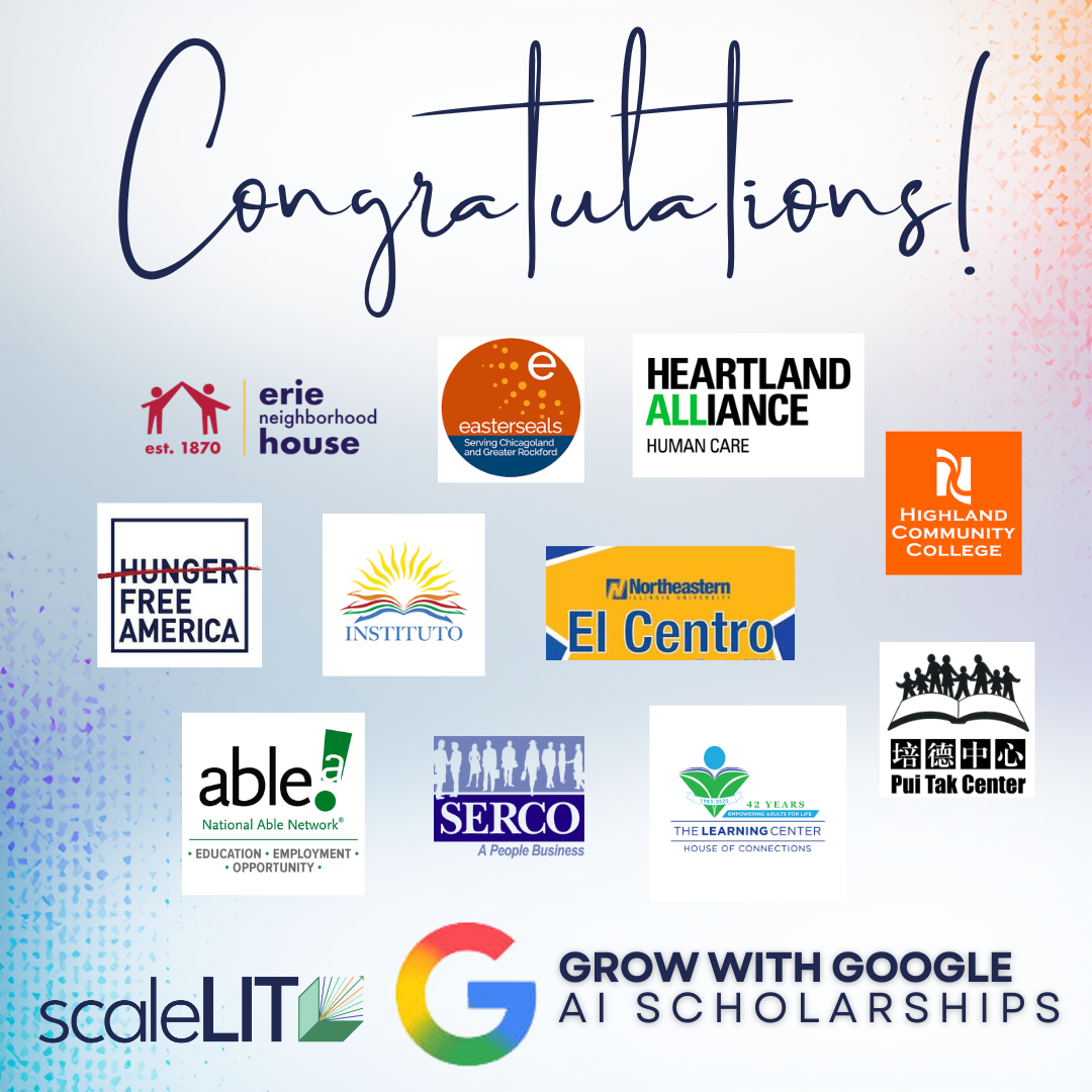 scaleLIT is proud to announce the selected organizations for our first Grow with Google AI Scholarship Cohort, marking an important step in supporting Illinois’ adult education and workforce ecosystem as it adapts to rapid technological change.