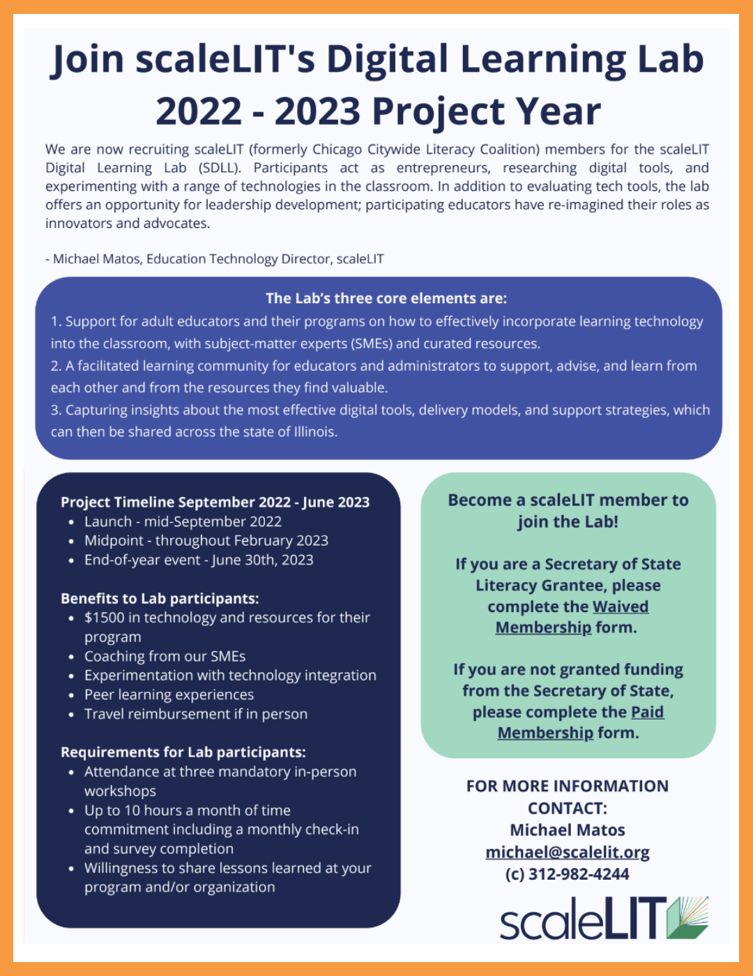 We are now recruiting scaleLIT members for the scaleLIT Digital Learning Lab (SDLL)! Participants act as entrepreneurs, researching digital tools, and experimenting with a range of technologies in the classroom.