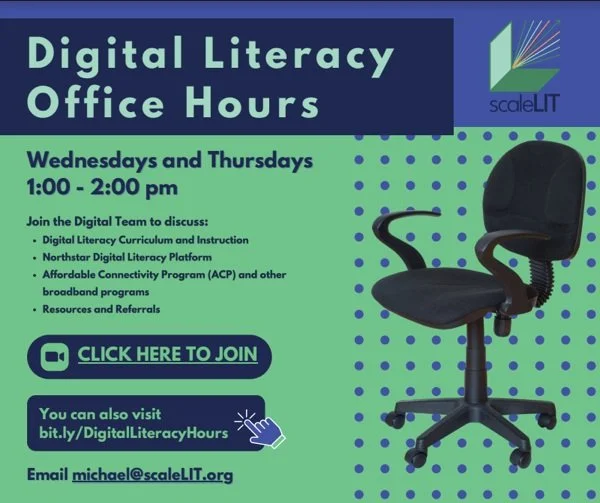 Need help with digital skills from program implementation to learner use or have questions about technology? Join us for scaleLIT’s Digital Literacy Virtual Drop-by Office Hours, hosted by Michael!