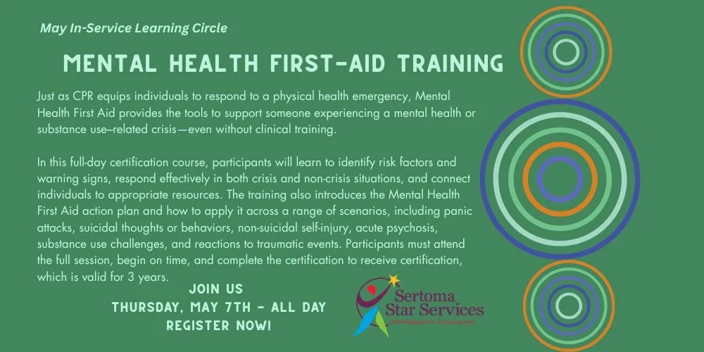 May In-Service Learning Circle: Mental Health First-Aid Training Thursday, May 7, 2026 8:30 AM 4:00 PM In-Person: Register on Membership DISCO space 700 North Sacramento Boulevard Chicago, IL, 60612 United States (map) Google Calendar ICS Register Here!